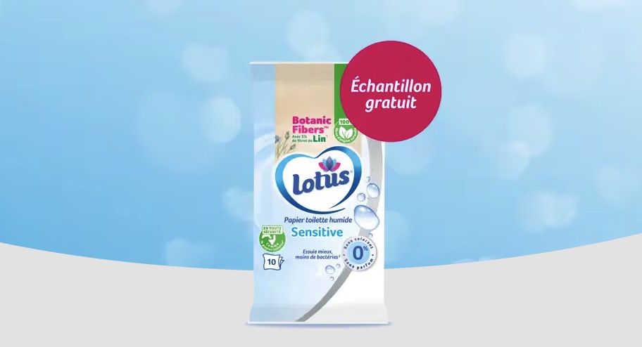Pour recevoir un échantillon gratuit de papier toilette humide Lotus, l'inscription à la newsletter de la marque est nécessaire. Cette offre permet de tester le produit sans frais, directement à votre domicile.
