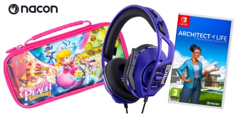 - 2 lots comportant 1 pochette Switch Princesse Peach + 1 casque RIG 300 Pro HS Acid + 1 code Architect Life (85€)