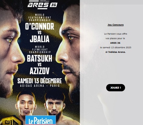 Sur leparisien.fr, 10 lots de 2 invitations sont mis en jeu pour le match de MMA "Ares 36" le 13 décembre à Paris.