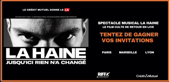 Riffx vous invite à jouer pour tenter de gagner 2 invitations pour le spectacle "La Haine" du 07 novembre au 04 janvier à Boulogne-Billancourt.