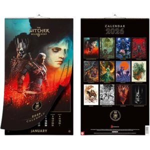 Calendrier mural 2026 célébrant les 10 ans de The Witcher 3: Wild Hunt, un jeu d'action-RPG développé par CD Projekt Red. Il met en avant dix années d'aventures à travers l'univers vidéoludique de la série.