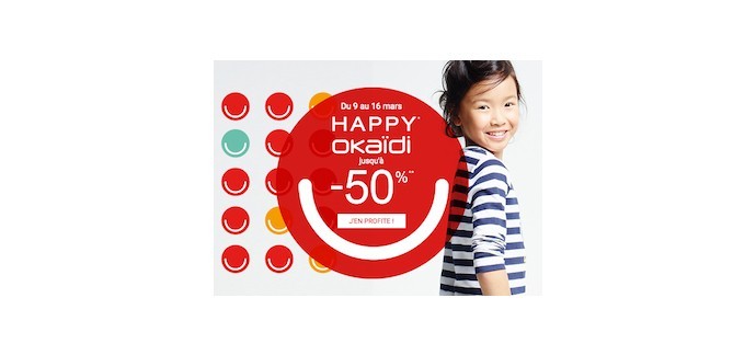 Happy Okaïdi : jusqu'au 16 mars 2016 inclus, bénéficiez jusqu'à 50% de remise sur une sélection de produits signalés par une pastille de couleur.