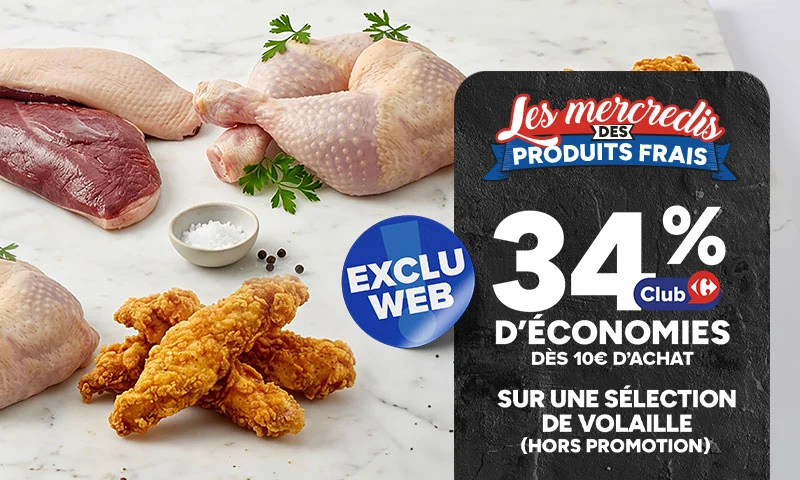 Promotion de 34% sur une sélection de volaille dès 10€ d'achat, valable aujourd'hui uniquement en hypermarché et drive Carrefour participants.